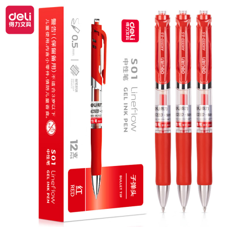 商品名稱:得力S01 紅色中性筆 簽字筆 0.5mm子彈頭經典辦公按動筆水筆 12支/盒