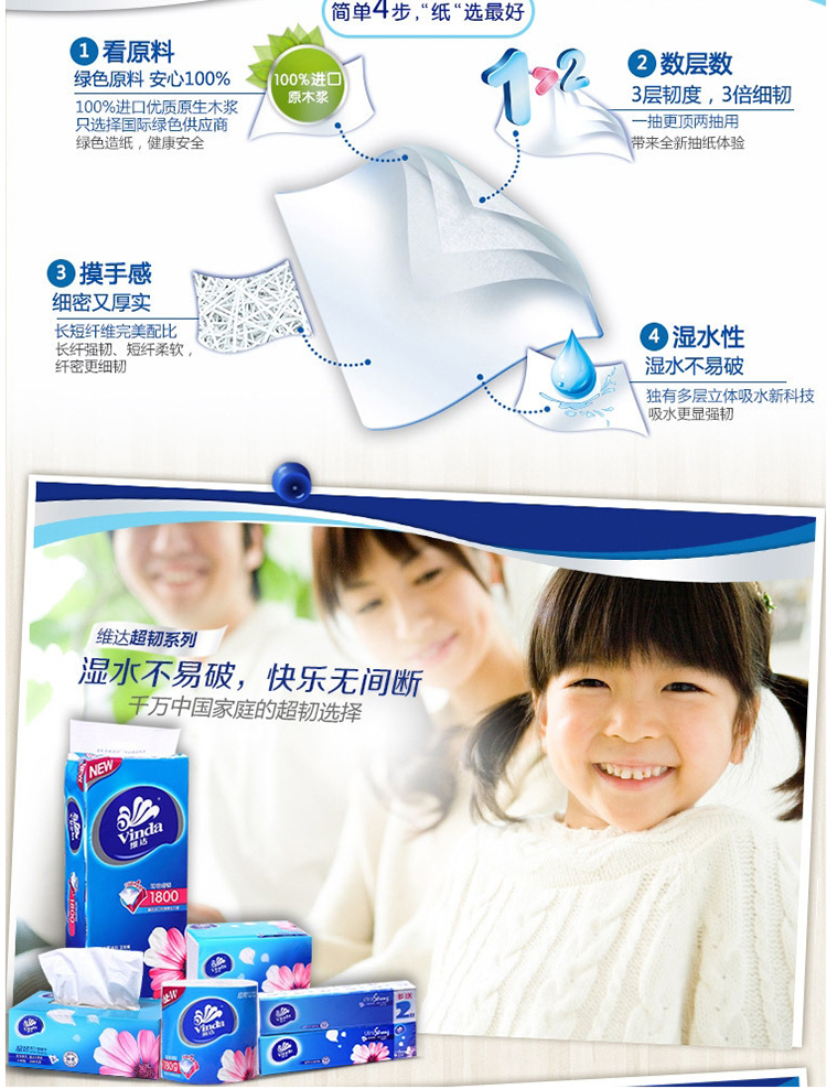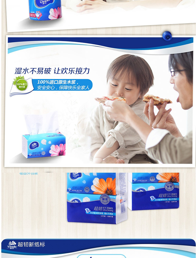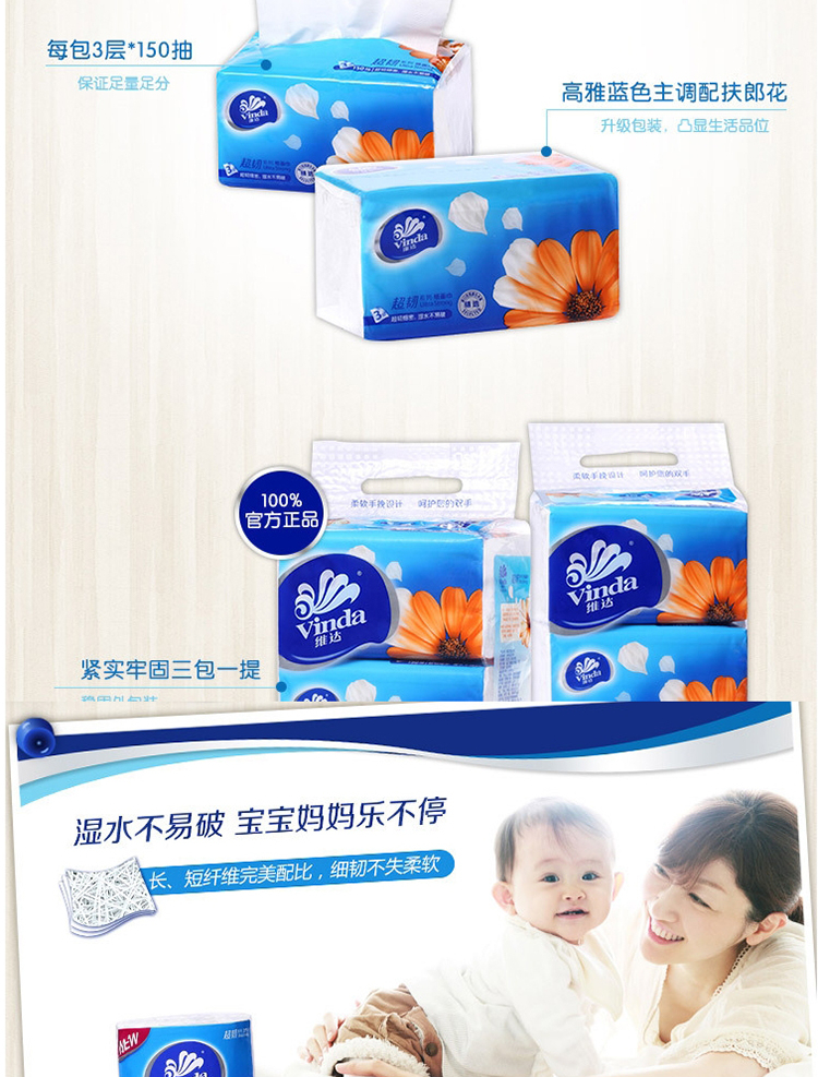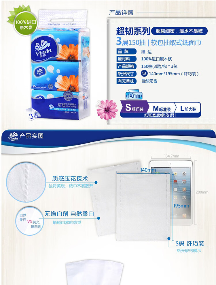 商品名稱:維達(dá)V2219 超韌3層抽取紙面巾150抽S碼 3包*16提 共48包 整箱