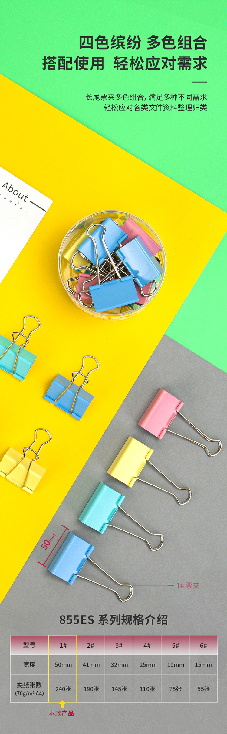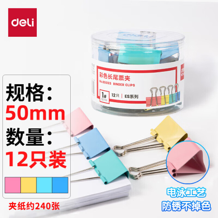 商品名稱:得力8551ES 彩色長(zhǎng)尾夾 1#50mm超大號(hào)金屬票夾燕尾夾票據(jù)文件夾子 辦公用品 12只/筒