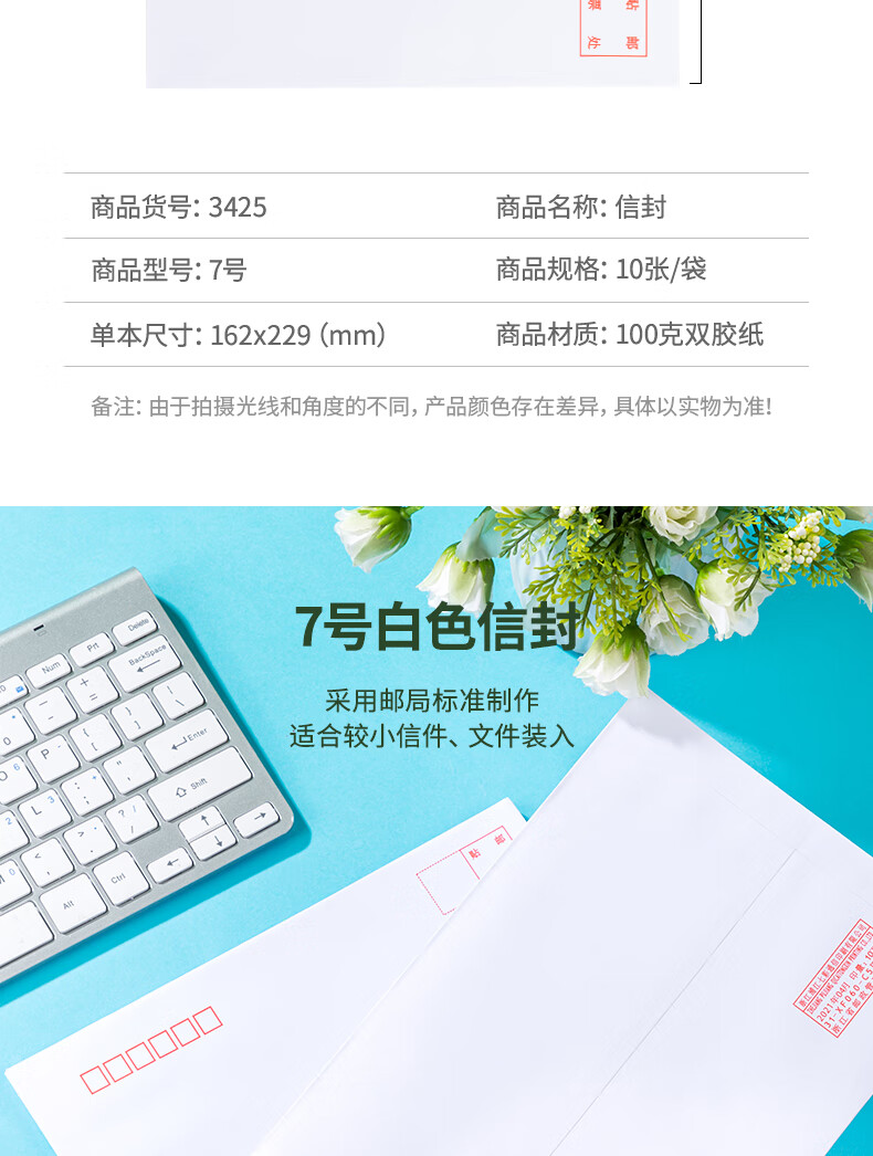 商品名稱:得力3425 白色信封 7號(hào)郵局標(biāo)準(zhǔn)信封229*162mm 10張/包