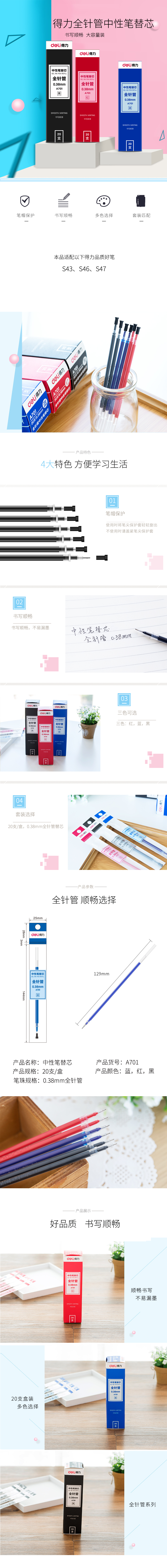 商品名稱:得力A701 中性筆芯 0.38mm全針管拔帽替芯 水筆簽字筆通用 黑色 20支/盒