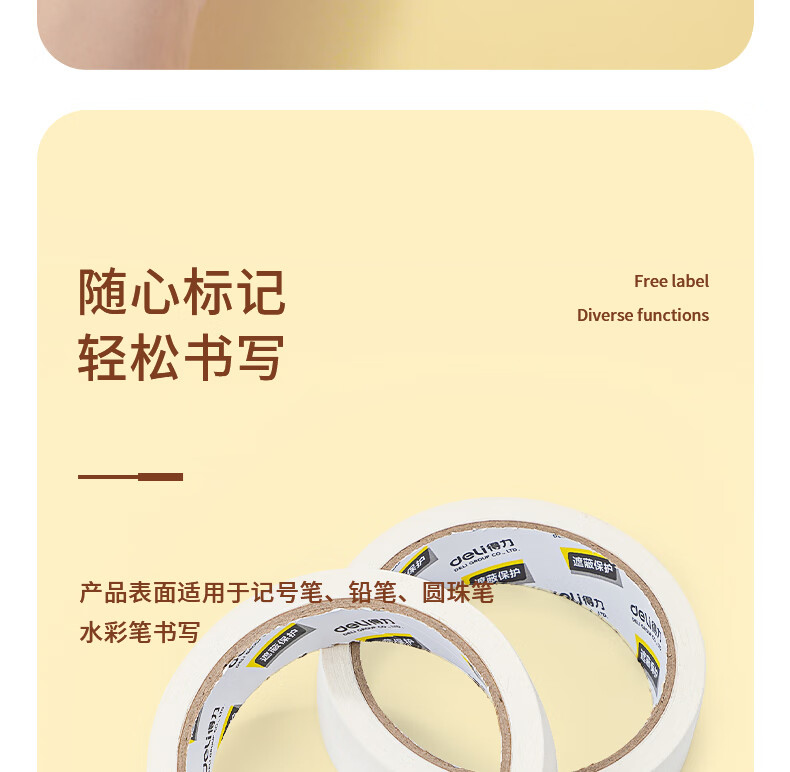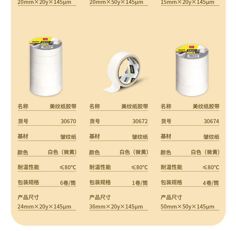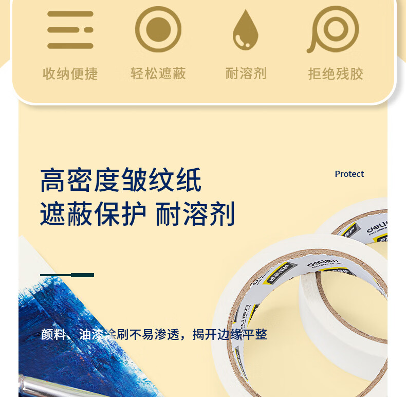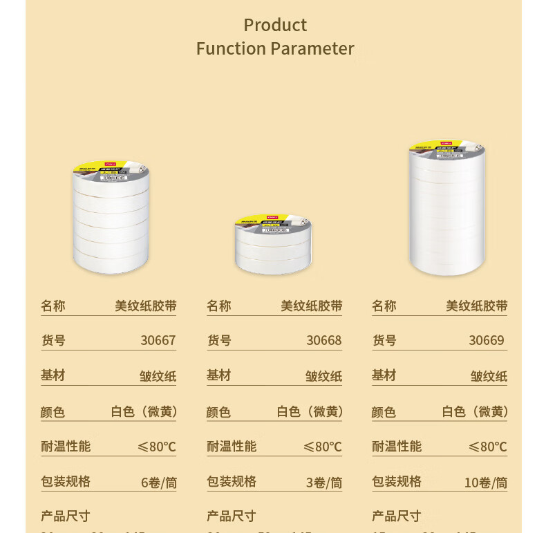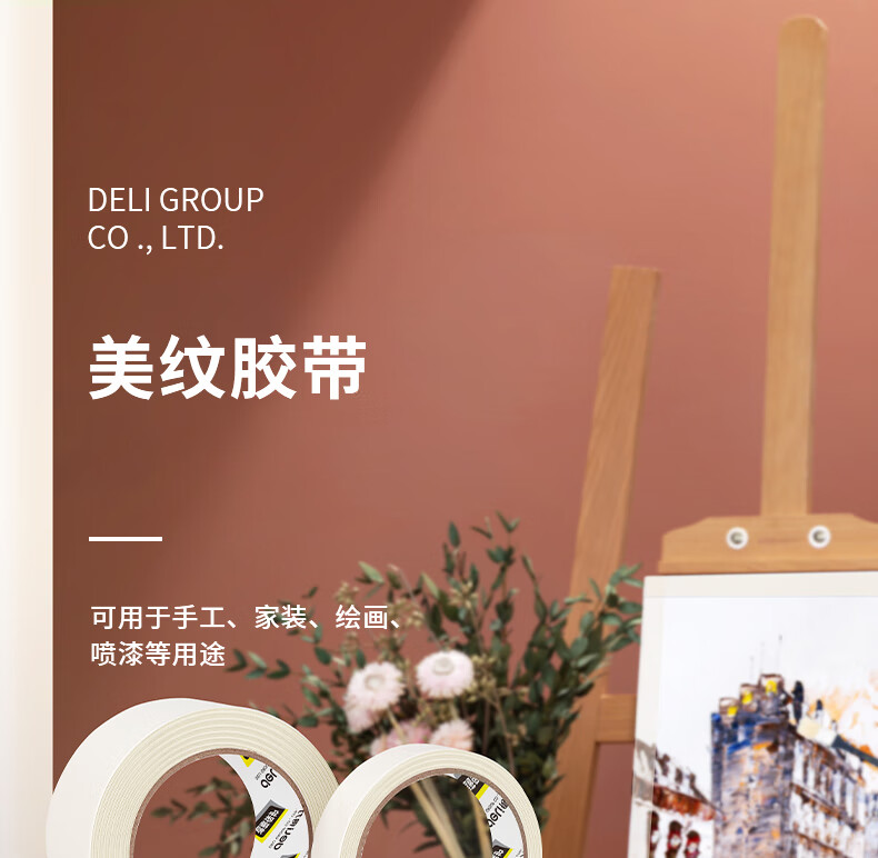 商品名稱(chēng):得力30669 美紋紙膠帶 15mm*20y*145um 美術(shù)美工分色 裝修遮蔽美縫貼膜刷漆保護(hù)無(wú)痕 10卷/筒