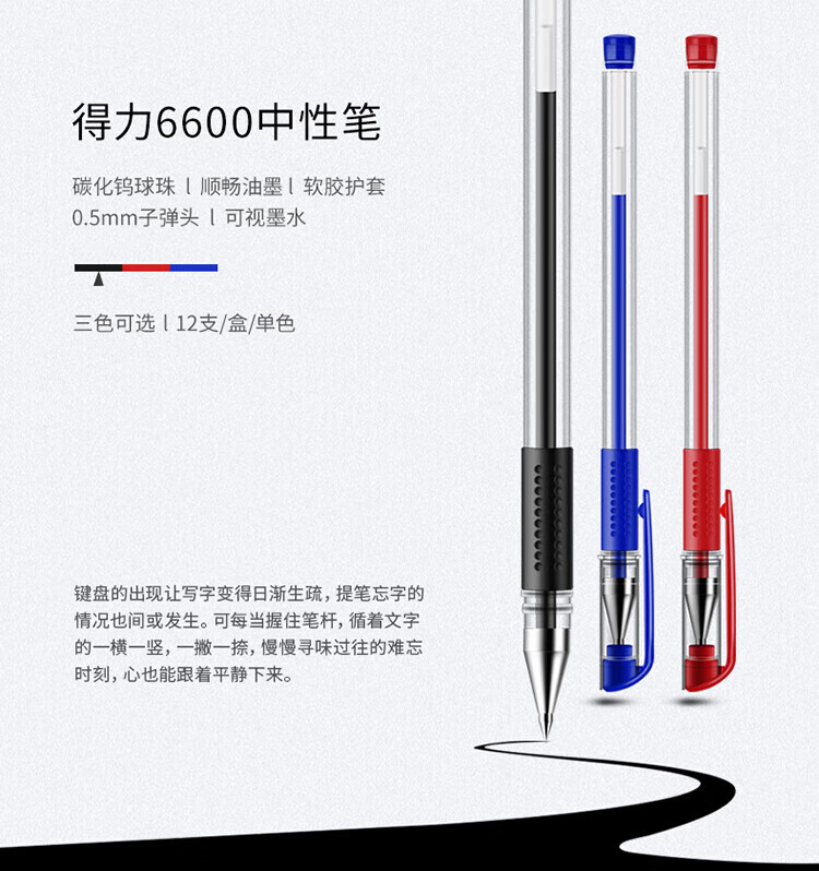 商品名稱:得力6600 中性筆 經(jīng)典辦公簽字筆 0.5mm子彈頭 黑色 12支/盒