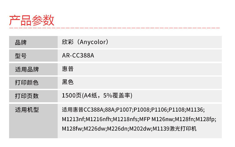 商品名稱:欣彩 AR-CC388A專業(yè)版 硒鼓 適用惠普 P1007/P1008/P1106/P1108/M1136/M1213nf/M1216nfh 黑色