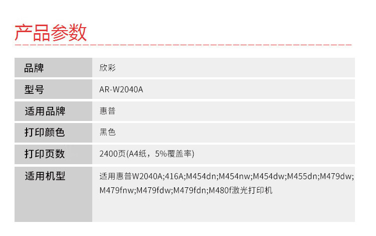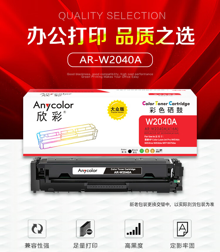 商品名稱:欣彩AR-W2040A黑色硒鼓 大眾版帶芯片 適用惠普W2040A 416A M454dn M454nw M454dw M455dn M479dw激光打印機