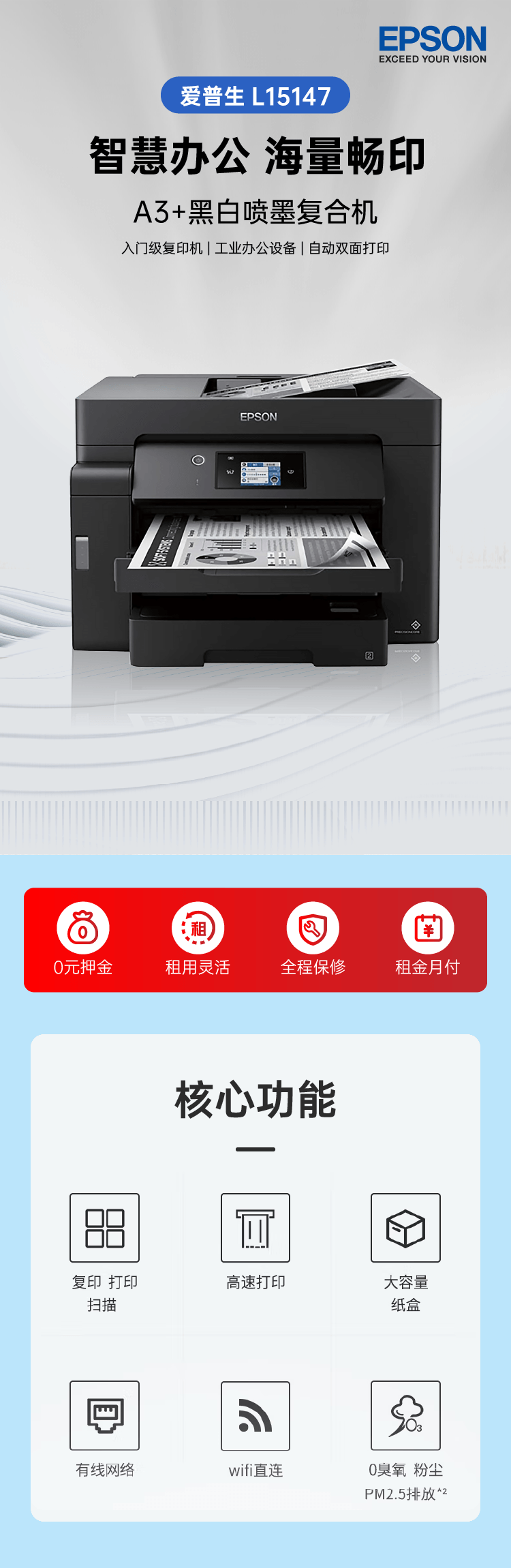 商品名稱:愛普生黑白噴墨復(fù)合機(jī)出租 茂名出租A3中速復(fù)印/打印/掃描一體機(jī)打印機(jī)租賃(月)