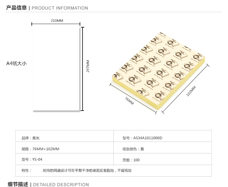 商品名稱:晨光YS-04 便利貼 3X4優(yōu)事貼 100頁(yè)自粘黃色留言貼便簽紙76X102mm 單位:本