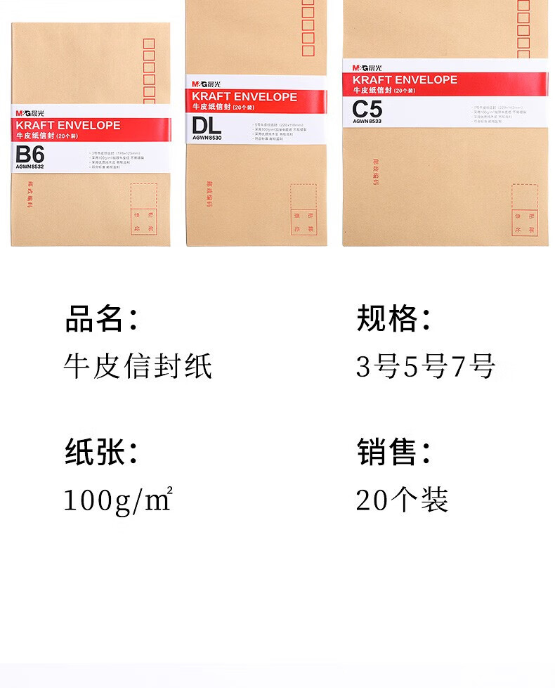商品名稱:晨光C5牛皮紙信封 7號信紙袋增值稅發(fā)票工資袋 20個/包AGWN8533